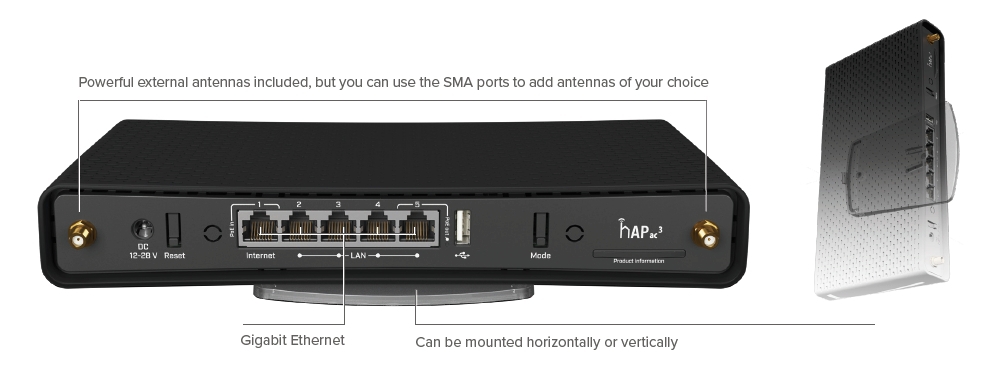 Vysoký dosah signálu a excelentní pokrytí objektu garantují externí anténky (o ziscích 3dBi/2,4GHz; 5,5dBi/5GHz).