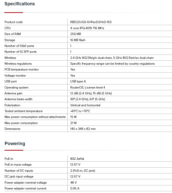 Antenna gain: 12 dBi (2.4 GHz), 15 dBi (5 GHz)