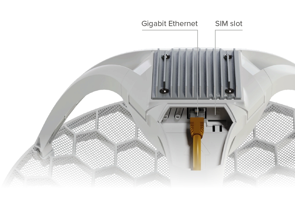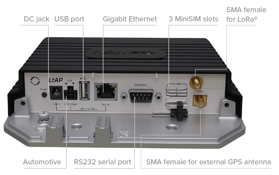 Mikrotik řešení LoRaWAN brány - v robustním outdoor casu integrovaný 2.4GHz přístupový bod s Gigabit Ethernet portem, vestavěnou GPS a dvěma interními LTE anténami.
