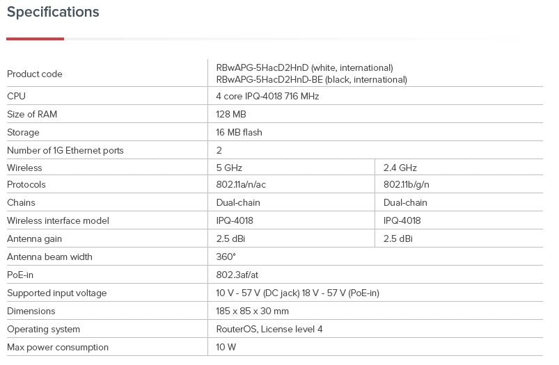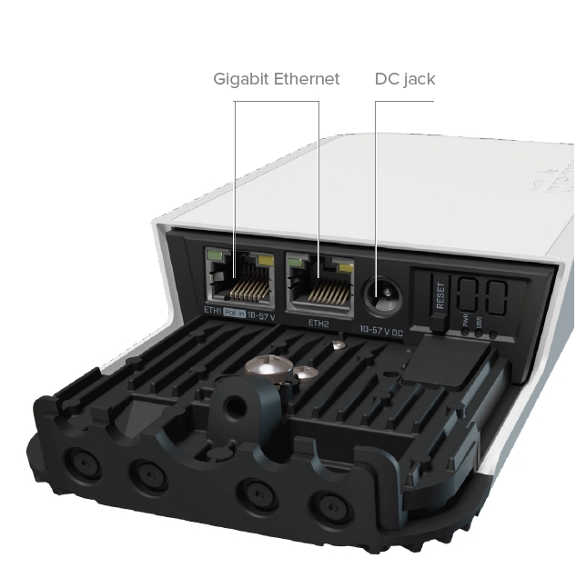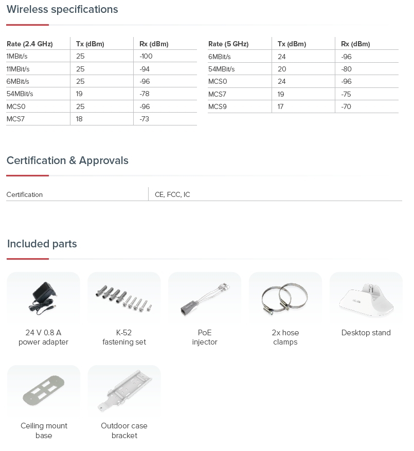 Zařízení má na ethernetové i rádiové části integrovanou přepěťovou ochranu, součástí je software RouterOS s předinstalovanou licencí L4, integrovaný PoE splitter pro napájení přímo po UTP kabelu.