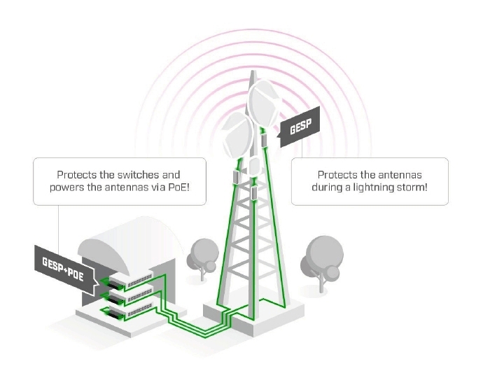 Ochrana se instaluje interně, chrání tak aktivní prvek (switch) a zároveň řeší napájení externě instalovaného aktivního prvku (anténu).