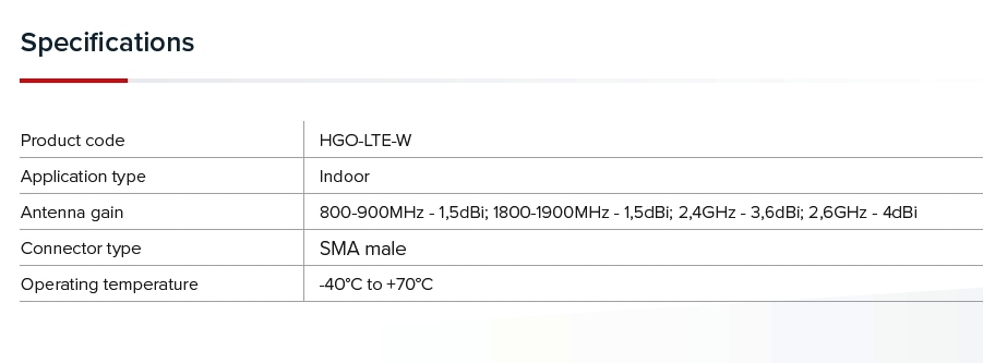LTE, CAT-M/NB i LoRa® o ziscích 1,5-4 dBi v šíři pásma 699 MHz-3,8 GHz.