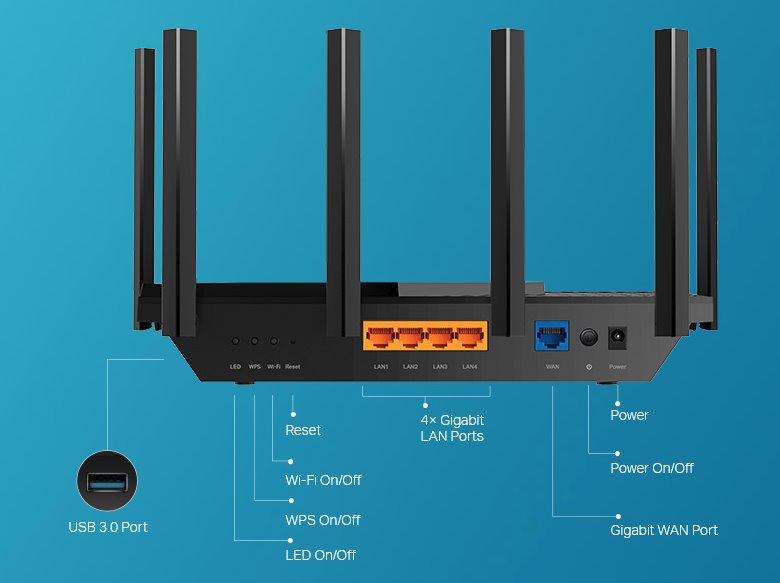 Dual-bandový moderní Wi-Fi 6 Router s podporou nejnovějšího WiFi standardu 802.11ax, zpětnou kompatibilitou s 802.11a/b/g/n/ac, Gigabitovými porty, 6 fixními anténami a jedním USB portem. Router podporuje MU-MIMO technologii pro obsluhu více zařízení záro