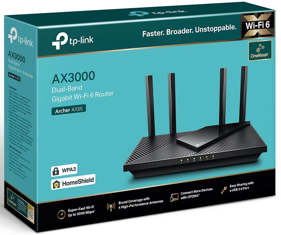 Archer AX55 je Wi-Fi 6 Dual-Band router značky TP-Link, který obsahuje 4× 10/100/1000Mbps LAN, 1× 10/100/1000Mbps WAN a 4 fixní antény. Bezdrátová část umí pracovat ve dvou pásmech zároveň a to rychlostí 574 Mbps ve 2.4 GHz pásmu a 2402 Mbps v pásmu 5 GHz. Router podporuje IPv4 i nejnovější IPv6 routování. Router kromě nejvíce používaného modu AP Router podporuje i režim Access point.
