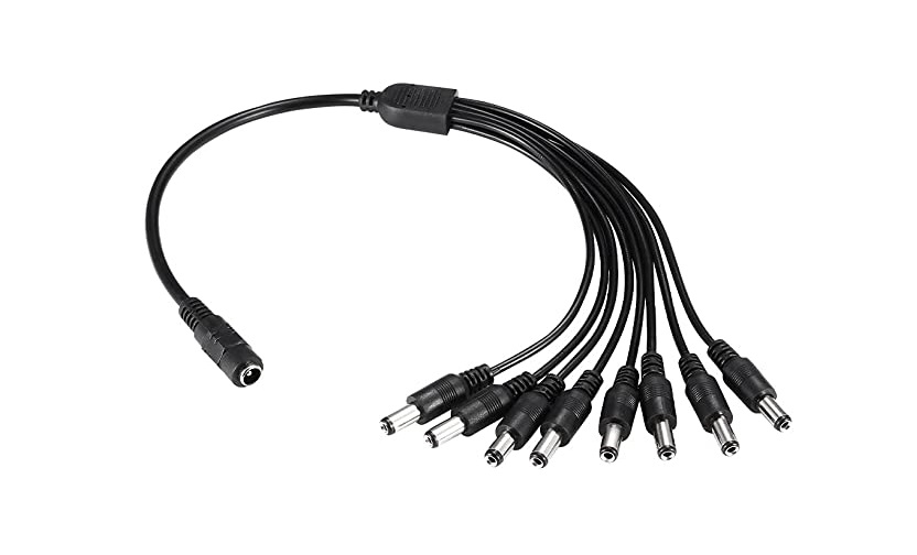 Kabelový DC rozbočovač s jedním vstupním a osmi výstupními jacky.