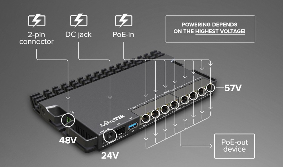 Samotná deska je napájena nejvyšším vstupním napětím - PoE-in. Pokud nastane problém, RB5009 se vrátí k druhému nejvyššímu napětí - na 2pinový konektor.