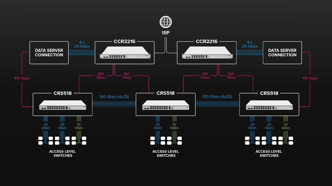 Následuje bleskurychlé 100-gigabitové připojení ke třem přepínačům distribuční úrovně prostředmictvím CRS518.