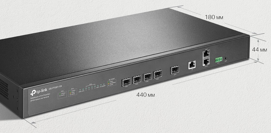 Centrální jednotka TP-Link DeltaStream DS-P7001-04 v provedení Pizza box slouží pro jednoduchou výstavbu GPON sítě pro přenos dat s výrazně nižšími náklady, kdy je speciálně určená pro podnikové přístupové sítě poskytovatelů internetových služeb. Je škálovatelná a spolehlivá pro zavádění služeb, které splňují požadavky různých zákazníků ISP. Celkem 4 porty GPON podporuje poměr rozdělení splitterů 1 : 128 pro každý port, které obslouží až 512 klientských ONU jednotek. Kromě toho nabízí i 1 SFP+ port, 1 GbE konektor RJ-45 pro uplink, 1 konzolový a managmentový RJ-45 port a alarmovou svorkovnici.