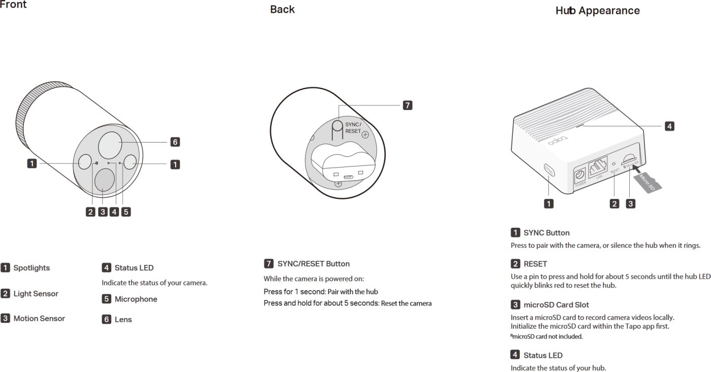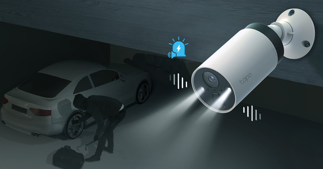Můžete spustit zvukový a světelný alarm, abyste zahnali nechtěné návštěvníky. Kameru můžete umístit také venku (krytí IP65). Zaznamenaná videa můžete ukládat na microSD kartu (až 256 GB) vloženou v hubu nebo do cloudového úložiště v rámci služby Tapo Care.