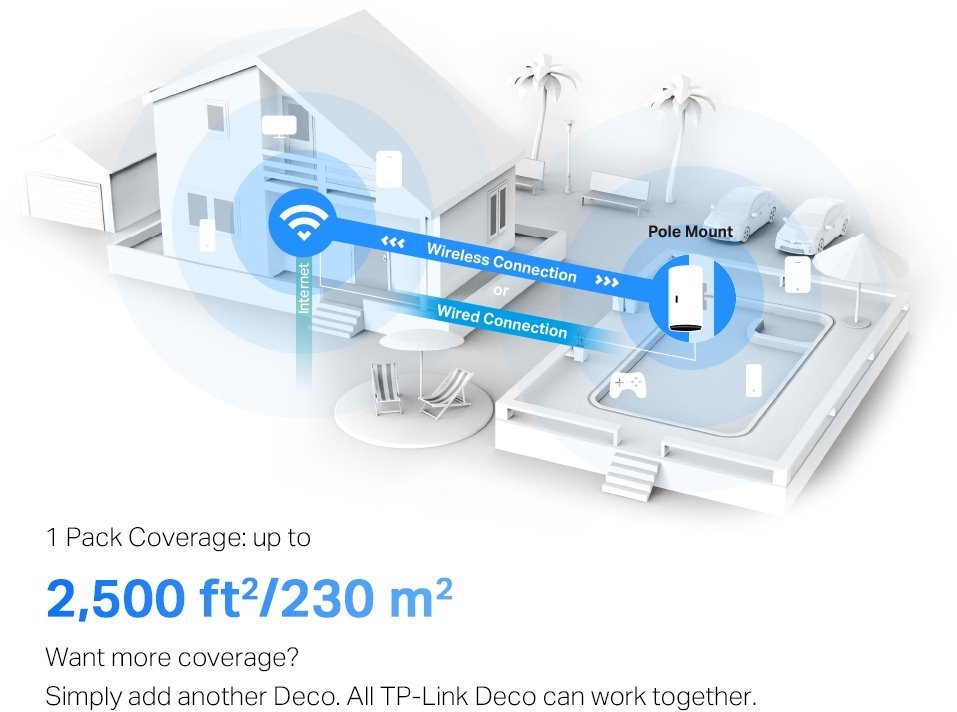 Deco X50-Outdoor je první venkovní jednotka z oblíbené řady Deco pro zaručeně silný signál Wi-Fi na zahradě či terase vašeho domova. Bezdrátové připojení a volitelné propojení všech jednotek buď ethernetovým kabelem, bezdrátově nebo kombinovaně poskytují