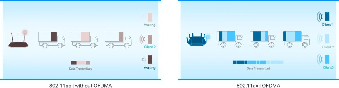 Technologie OFDMA vytváří samostatné segmenty kanálů pro komunikaci s jednotlivými zařízeními, zatímco MU-MIMO umožňuje více klientům současně přijímat data. Kombinace těchto technologií zaručuje, že váš počítač získá silné, efektivní a bez zpoždění bezdrátové připojení, zatímco všechna vaše ostatní zařízení komunikují.