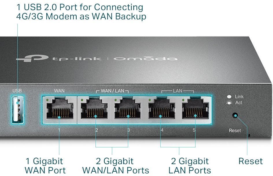 Profesionální, bezpečný a spolehlivý Gigabitový router s vlastním webovým managementem ale i možností centralizované správy pomocí Omada Software Defined Networking (SDN) a to odkudkoliv a kdykoliv. Router disponuje celkově 5 Gigabitovými metalickými porty z čehož je 1× WAN, 2× LAN a 2× LAN/WAN. Router pro přístup do lokální sítě umožňuje nastavení i několika možností VPN serverů a to konkrétně: IPsec, PPTP, L2TP a OpenVPN.