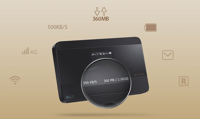 Směrovač TP-LINK M7350 je špičkové zařízení pro sdílení v bezdrátových 4G sítích. Stačí vložit 4G SIM kartu do zařízení a okamžitě vytvořit volitelný dvoupásmový Wi-Fi hotspot. Směrovač M7350 dokáže díky rychlosti stahování 150 Mbit/s a uploadování 50 Mbit/s poskytnout možnost sdílení v 4G síti až 15 uživatelům najednou. Díky jeho kapesní velikosti a výkonné interní baterii s kapacitou 2550 mAh se z něj stává ideální zařízení na cesty, kdy uživatelům umožní 10 hodin práce či hraní. Disponuje inovativním TFT displejem, takže uživatelé získají mnohem intuitivněji informace o provozním stavu zařízení, jako např. o síle signálu, typu sítě (4G/3G/2G), dostupnosti Wi-Fi, zprávách, internetu, statistikách provozu a stavu baterie.