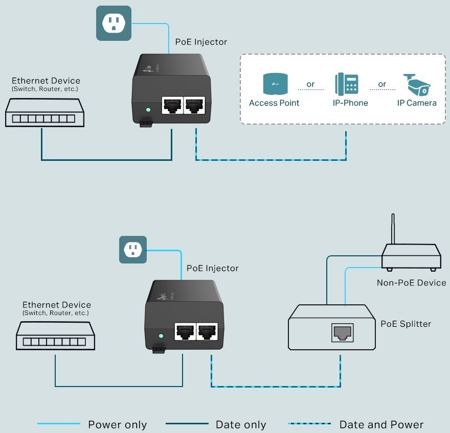 TL-POE160S je velmi robustní Gigabitový napájecí PoE injektor, který podporuje 802.3af/at standardy s výkonem až 30W, což je vhodné řešení pro napájení většiny IP kamer s podporou PoE, VoIP, WiFi AP a dalších zařízení. Injektor má LED indikaci, 3-pinový napájecí konektor na 230V a dva RJ-45 porty z nichž první je určen na DATA a druhý na DATA + napájení.