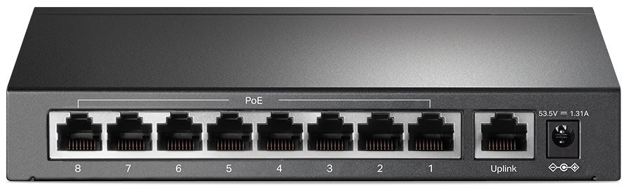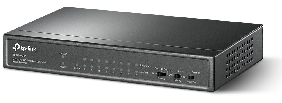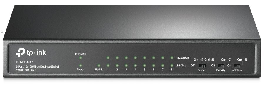 TP-Link PoE Switch TL-SF1009P je nemanagovatelný PoE Switch s 9x 10/100Mbps z čehož jeden je označen jako Uplink bez možnosti PoE a zbylých 8 podporuje PoE-Out se standardy 802.3af/at (až 30W/port). Celkový PoE budget switche je 65W. Switche umožňuje i PoE na vzdálenost 250m při přepnutí speciálního přepínače, který způsobí ponížení linkové rychlosti na PoE portech na 10Mbps, což pro přenos obrazu z kamer bohatě stačí. Dalšími bonusy switche je izolaci jednotlivých PoE portů a prioritní porty 1 a 2.