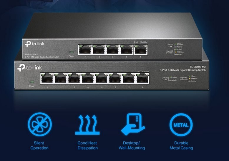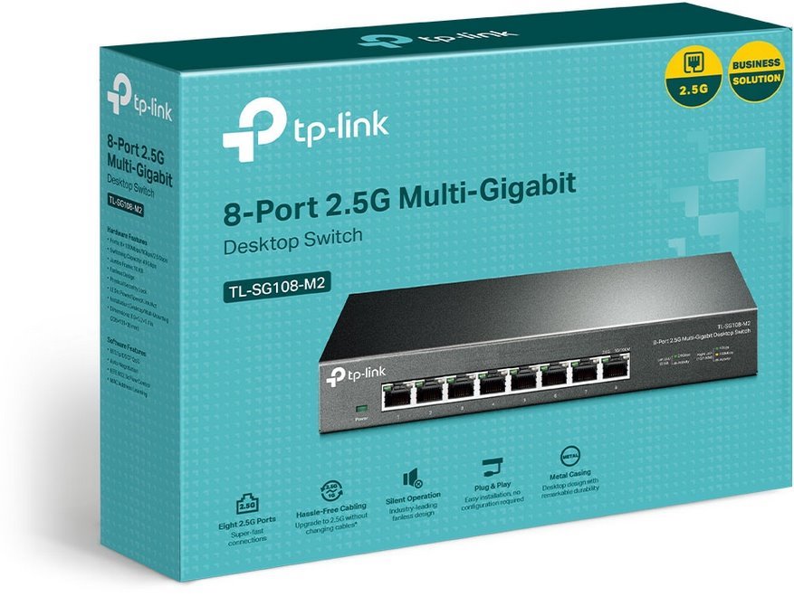 Firma TP-Link přichází s novou řadou Multi Gigabitových switchů, které dokážou navázat až 2.5Gbps link na každém portu. Tento základní model TL-SG108-M2 bez managementu v kovovém šasi má má celkově 8 metalických portů s rychlostí 100M/1G/2.5G, indikační LED na každém portu a jeden DC konektor pro napájení switche na zadní straně.