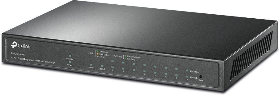 TP-Link TL-SG1210MPE je Gigabitový desktopový managovatelný switch v odolném kovovém šasi s 10× Gigabit LAN a jedním combo SFP, z čehož 8 ethernetových portů podporuje i PoE out 802.3af/at pro napájení kamer, access pointů a podobných zařízení s podporou aktivního PoE. Celkový PoE budget na portech 1 až 8 je celkem 123 W s omezením 30 W/port. Switch lze spravovat jak webové rozhraní tak i přes dedikovanou utilitu.