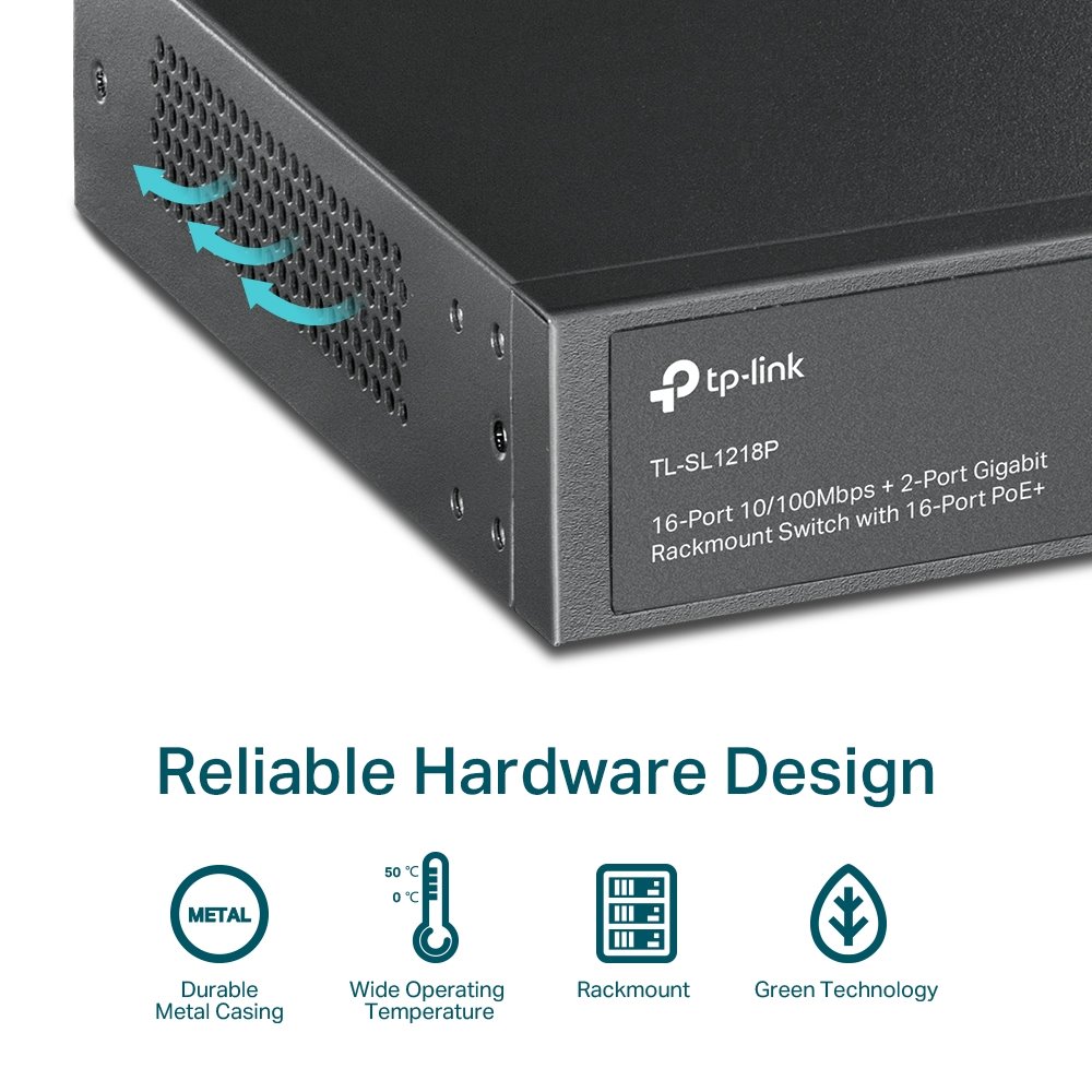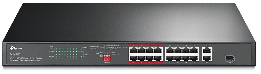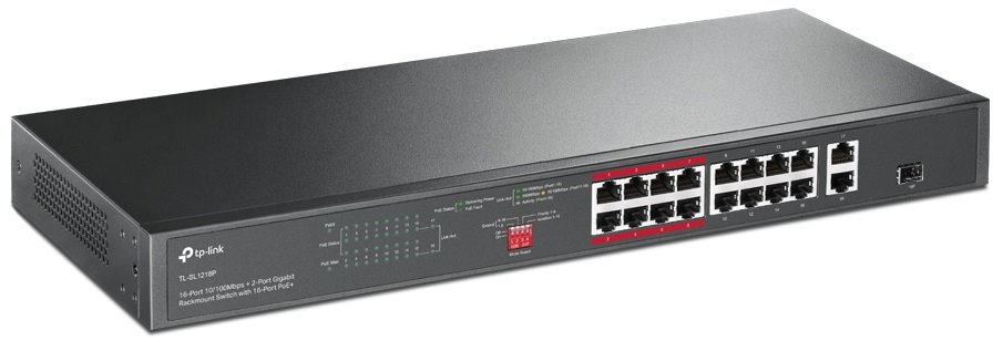 TL-SL1218P je nemanagovatelný rackmount PoE switch s 18ti porty a jedním combo SFP. Prvních 16 portů mají rychlost 10/100Mbps a podporují 802.3af/at PoE s maximální spotřebou 30W/port a celkovým PoE budgetem 150W. Další 2 porty jsou gigabitové, sloužící jako uplink do sítě z čehož poslední port je jako combo port s gigabitovým SFP portem. Switch má na portech 1-16 možnost přepnutí na Extended Mode, což pomůže například při instalaci kamer, kdy dosah ze 100m je rozšířen až na 250m. Při této funkci je link ponížen na 10Mbps.