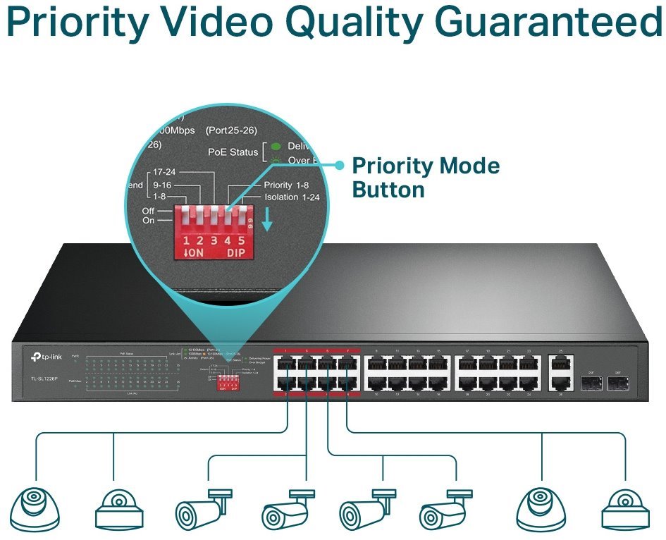 Díky přepínačům na přední straně je možné pro vybrané skupiny portů prodloužit dosah pro napájená zařízení až na 250 metrů. Linková rychlost je v tomto případě pouze 10Mbps, což je však dostačující například pro IP kamery. Lze rovněž nastavit prioritu pro skupinu prvních 8 portů, abyste dosáhli maximální kvality např. pro přenosy videa. Porty lze mezi sebou také izolovat, abyste minimalizovali broadcastový provoz a zvýšili zabezpečení své sítě.