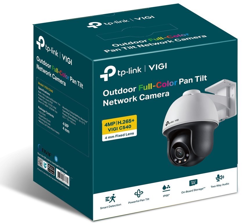 VIGI IP kamera C540(4mm) v provedení PTZ dome, disponuje 4 MP fixním objektivem (2560 x 1440, 30 fps) s ohniskovou vzdáleností 4 mm, snímačem 1/3", digitálním WDR a citlivostí 0 Lux pro nahrávání barevného (Full-Color) obrazu i během noci. Nechybí ani slot na microSD karty, IR/bílé světlo na vzdálenost 30m, audio mikrofon i reproduktor, krytí IP66 a 10/100 Mbps LAN port s podporou PoE napájení.