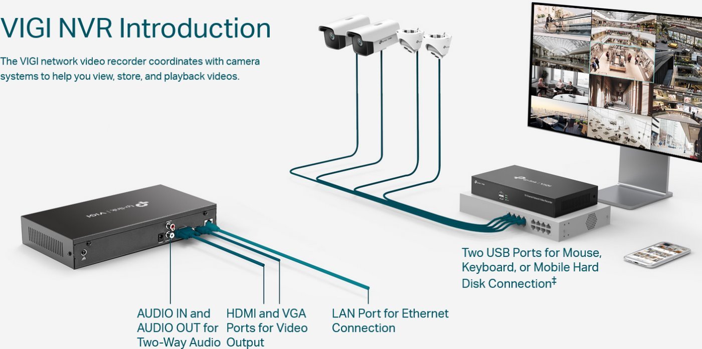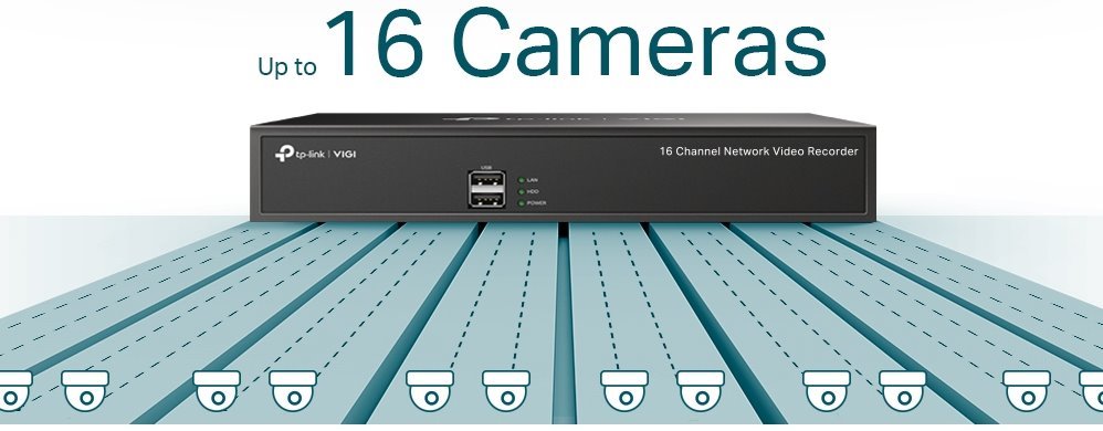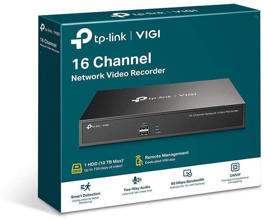 VIGI NVR1016H je záznamové zařízení od značky TP-Link pro nahrávání až 16 IP kamer. Dokáže nahrávat kamerové záznamy v maximálním rozlišení až 8 MP. Do sítě lze zařízení připojit jedním 10/100Mbps LAN portem. Mezi konektory nechybí 2 USB porty na přední straně pro připojení klávesnice a myši, audio vstup/výstup, HDMI a VGA konektor. Maximální spotřeba samotného rekordéru bez HDD je 4.3 W.