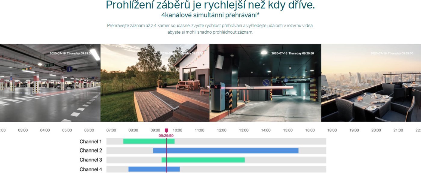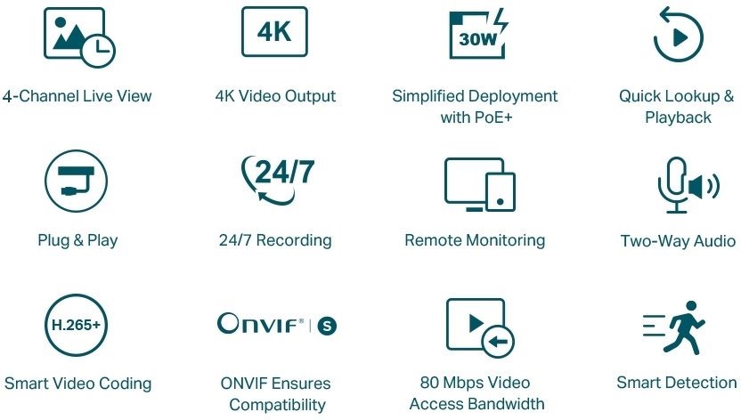 Záznamové zařízení od značky TP-Link pro nahrávání a napájení až 4 IP kamer. Dokáže nahrávat kamerové záznamy v maximálním rozlišení až 8 MP. Do sítě lze zařízení připojit jedním 10/100 Mbps LAN portem a další 4x 10/100 Mbps LAN mají podporu 802.3af/at PoE s celkovým PoE budgetem 53W. Mezi konektory nechybí 2 USB porty pro připojení klávesnice a myši, audio vstup/výstup, 4K HDMI a VGA konektor. Maximální spotřeba samotného rekordéru bez HDD a připojených kamer je 4.25 W.