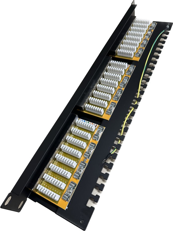 19" osazený stíněný 24-portový CAT5E patch panel DATAWAY černé barvy s duální svorkovnicí 110/Krone. Patch panel obsahuje montážní sadu M6 pro uchycení do 19" rozvaděče , jakož i vyvazovací lišta.