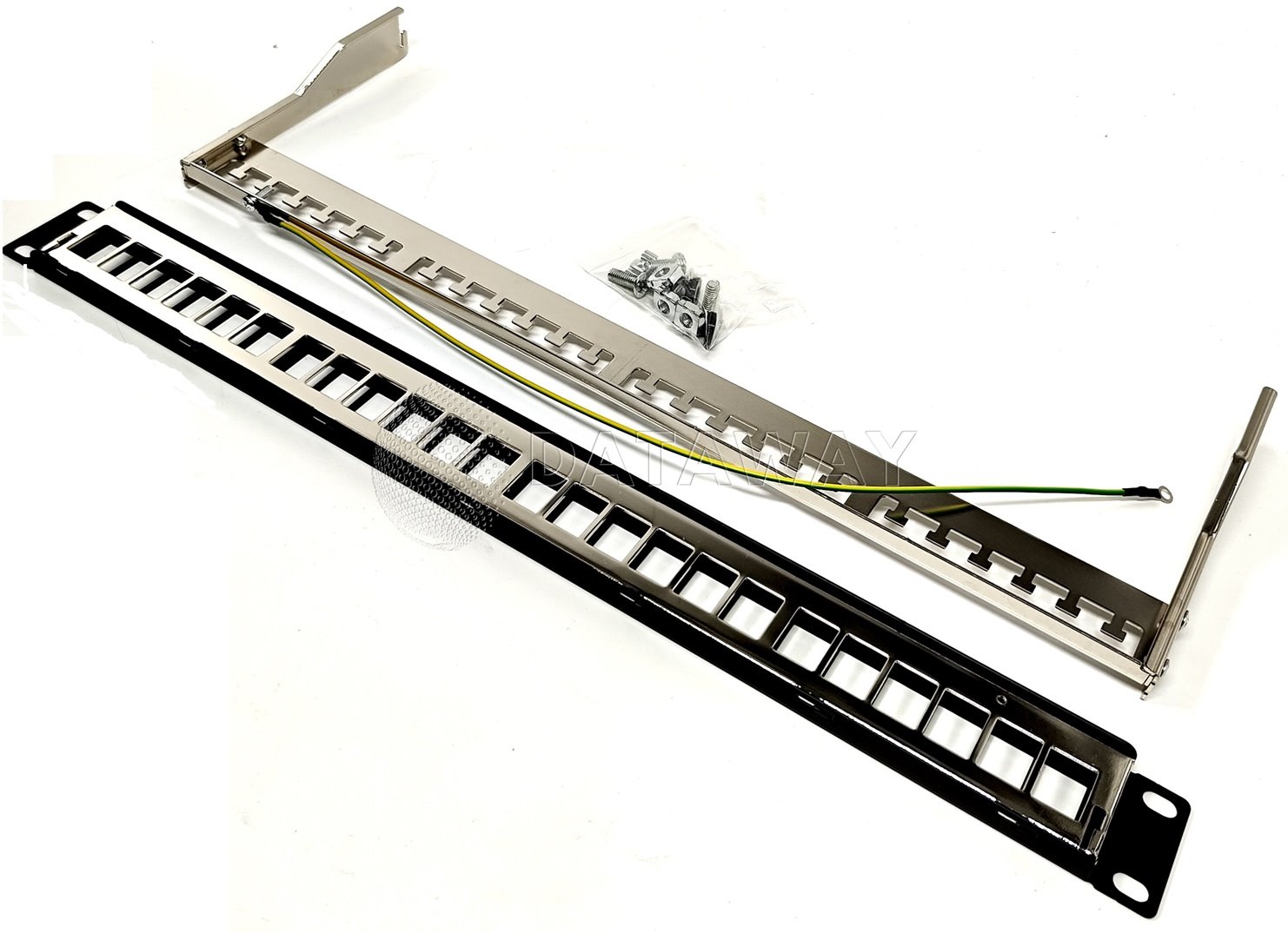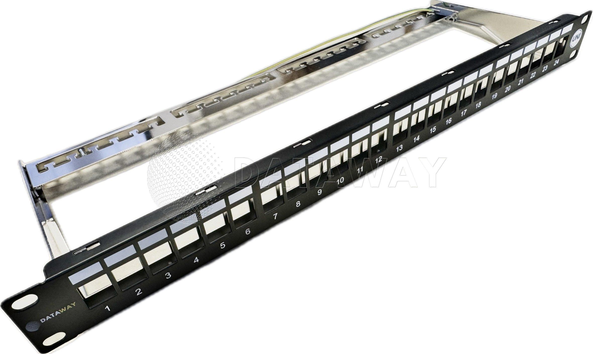 19" patch panel DATAWAY černé barvy v modulárním provedení je kompatibilní se samořeznými keystony kategorie CAT5E/CAT6/CAT6A. Patch panel obsahuje montážní sadu M6 pro uchycení do 19" rozvaděče , jakož i vyvazovací lišta.