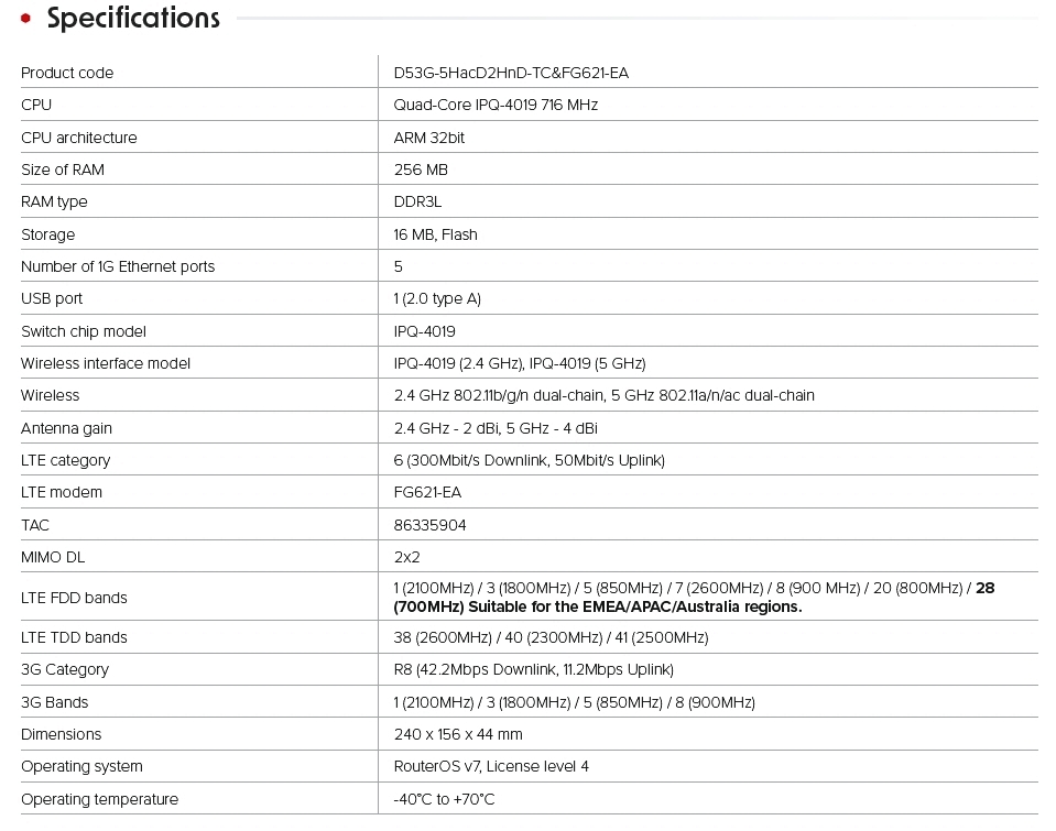 LTE FDD bands: 1 (2100MHz) / 3 (1800MHz) / 5 (850MHz) / 7 (2600MHz) / 8 (900 MHz) / 20 (800MHz) / 28 (700MHz) Suitable for the EMEA/APAC/Australia regions.