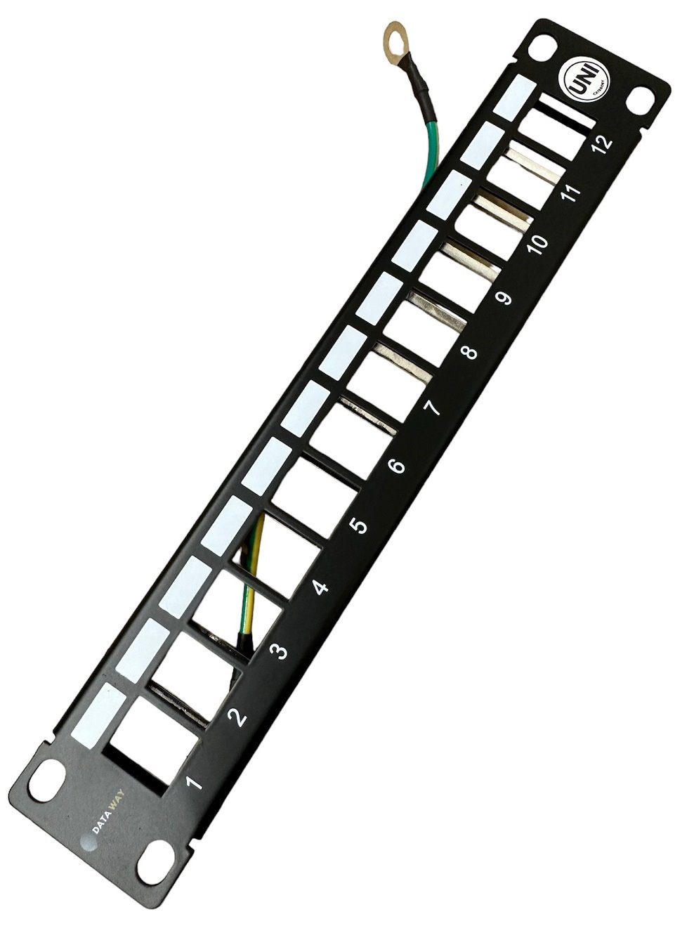 Patch panel DATAWAY je univerzální 10" neosazený patch panel, který je určený pro 12 stíněných i nestíněných keystonů. Modulární provedení patch panelu umožňuje pohodlnou instalac. Tento patch panel je vybavený uzemňovacím drátem, který umožňuje jeho propojení s uzemněním rozvaděče. Barva patch panelu je černá, velikost v datovém rozvaděči je 1U. V případě potřeby lze zaslepit volné porty panelu záslepkou.