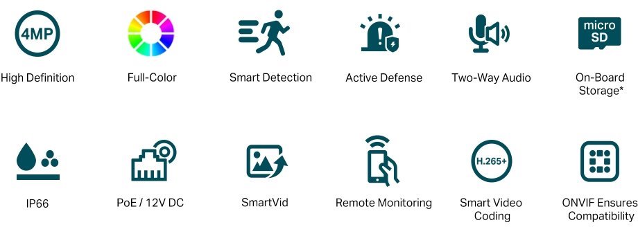 VIGI C340(2.8mm) je 4 megapixelová venkovní bullet kamera značky TP-Link s fixním objektivem 4 mm, bílým světlem a IR přísvitem do vzdálenosti 30 m a ethernetovým portem s podporou PoE. Kamera má max. rozlišení 2560 × 1440 px (při 30 fps), pozorovací úhel 102°, 2 nezávislé streamy, krytí IP66, digitální WDR snímač, obousměrné audio (mikrofon i reproduktor), slot na microSD kartu a podporu ONVIF a kodeku H.264(+) a H.265(+). Kamera díky větší citlivosti podporuje tzv. Full-Color barevný obraz během celé noci.