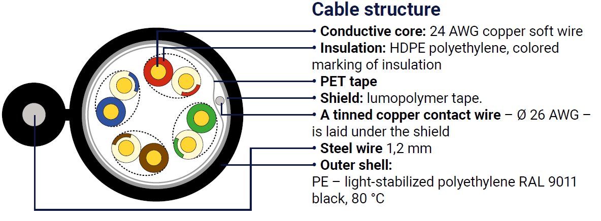 Kvalitní síťové stíněné samonosné kabely pro venkovní použití DATAWAY podporující protokoly 1000Base-Tkategorie CAT5E, s podporou šířky pásma až 100 MHz..