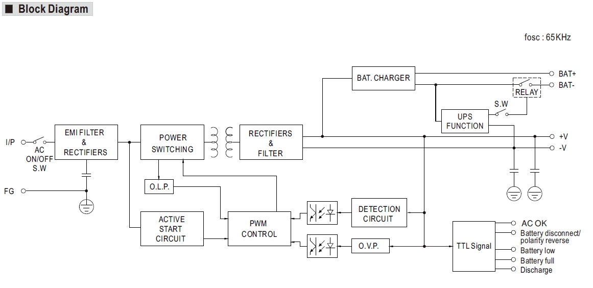• TTL signály pro detekci stavu: AC OK, odpojení baterie, přepólování baterie, vybití baterie, plná baterie a vybití baterie.