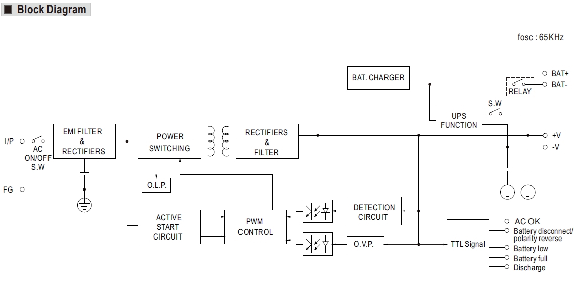 • TTL signály pro detekci stavu: AC OK, odpojení baterie, přepólování baterie, vybití baterie, plná baterie a vybití baterie.