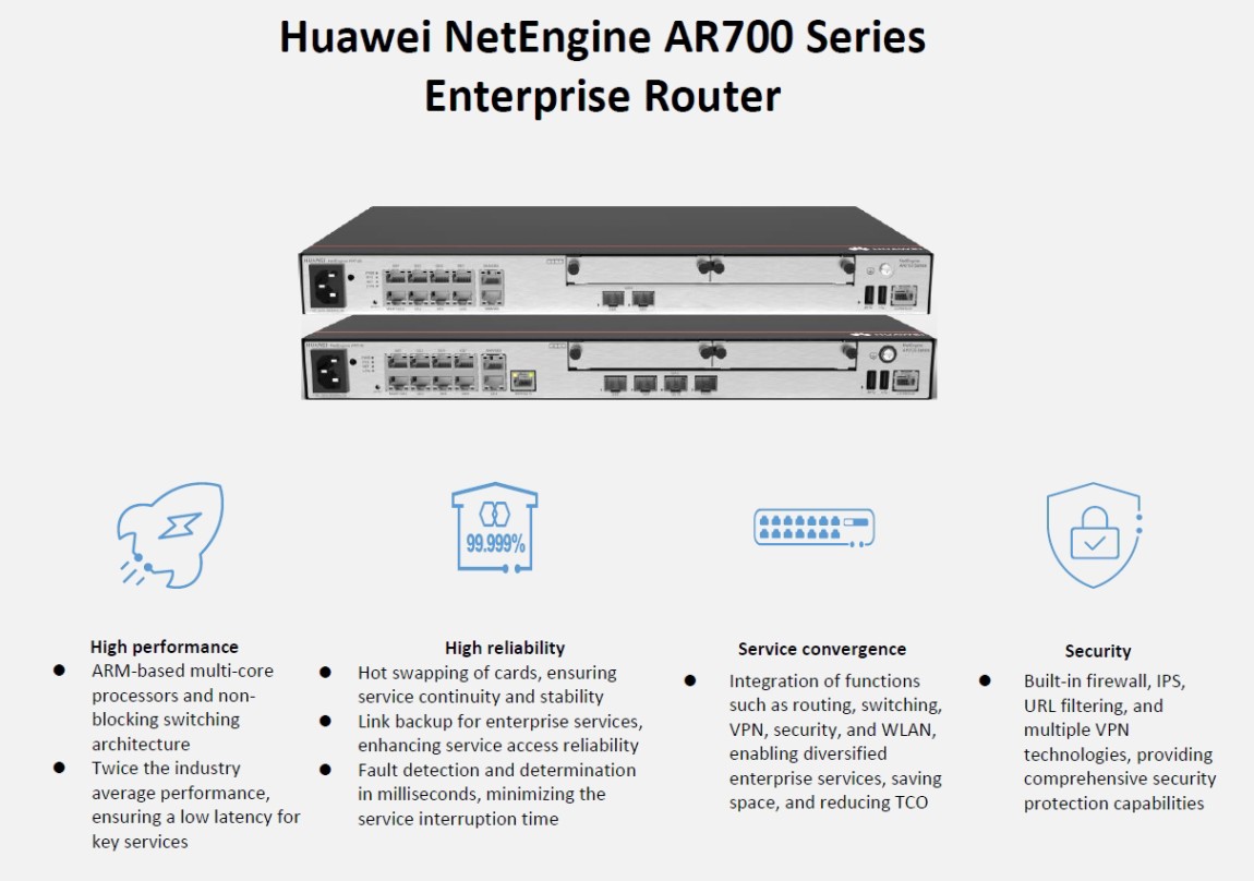 Routery Huawei NetEngine řady AR700 jsou vysoce výkonné směrovače nové generace. Využívají vícejádrové procesory ARM a neblokující přepínací architekturu, která poskytuje dvojnásobný výkon oproti průměru v oboru. Navíc integrují různé funkce, jako je 5G, směrování, přepínání, VPN, zabezpečení a MPLS, a umožňují tak diverzifikované podnikové služby v éře cloudu.