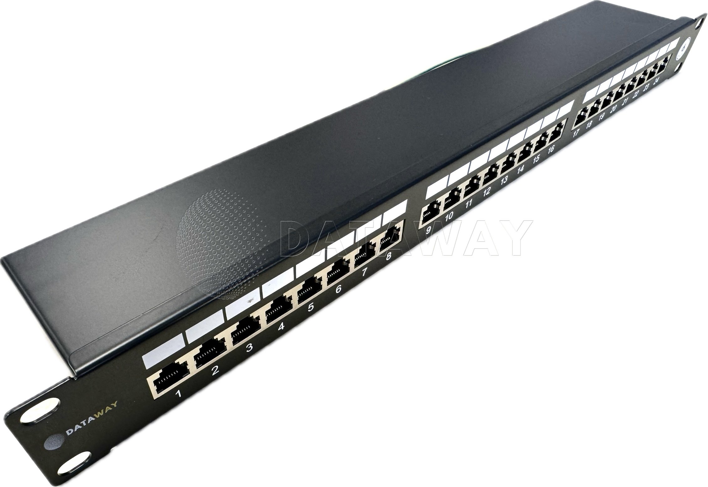 19" osazený 24-portový stíněný CAT6 patch panel DATAWAY černé barvy s duální svorkovnicí 110/Krone. Patch panel obsahuje montážní sadu M6 pro uchycení do 19" rozvaděče , jakož i vyvazovací lišta.