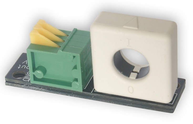 Hallův proudový senzor který měří proud v drátě přes otvor senzoru. Nevyžaduje přerušení kabelu a instalaci svorek.