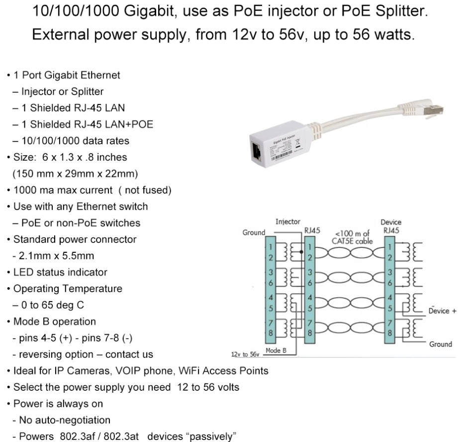 Injektor s širokým rozsahem napájecích hodnot (12-56V) je vhodný pro širokou škálu síťových prvků (přístupové body, IP kamery, VoIP, modemy, apod.).