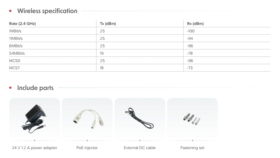 K dispozici je ethernetový port pro kabelová zařízení a klasické bezdrátové rádio 2,4 GHz.