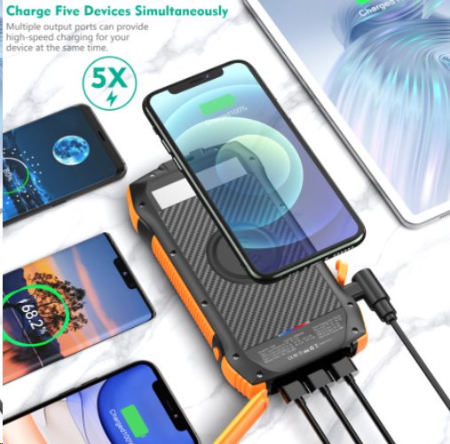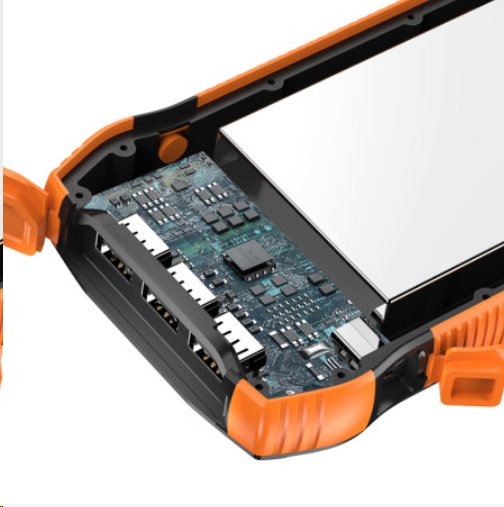 Outdoor solární powerbanka s kapacitou 20000 mAh (nabije až 10 zařízení), vodě a prachu odolná dle IP67, solární panel pro záložní dobíjení, bezdrátové nabíjení telefonů 10W, podpora quick charge 3.0 pro rychlé dobíjení PD 18W , Super Fast USB-C nabíjení Power Delivery PD 20W, simultální nabíjení a vybíjení až 4-mi konektory USB a C + bezdrátové nabíjení = až 5 zařízení možno nabíjet najednou, silná a jasná LED svítilna s mnoha funkcemi, závěsný popruh na trecking.