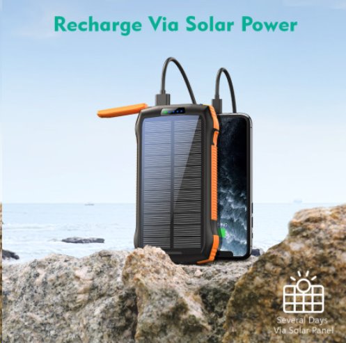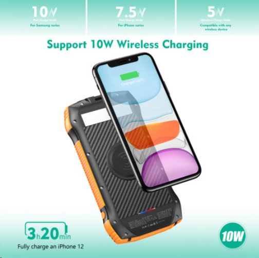 Outdoor solární powerbanka s kapacitou 20000 mAh (nabije až 10 zařízení), vodě a prachu odolná dle IP67, solární panel pro záložní dobíjení, bezdrátové nabíjení telefonů 10W, podpora quick charge 3.0 pro rychlé dobíjení PD 18W , Super Fast USB-C nabíjení