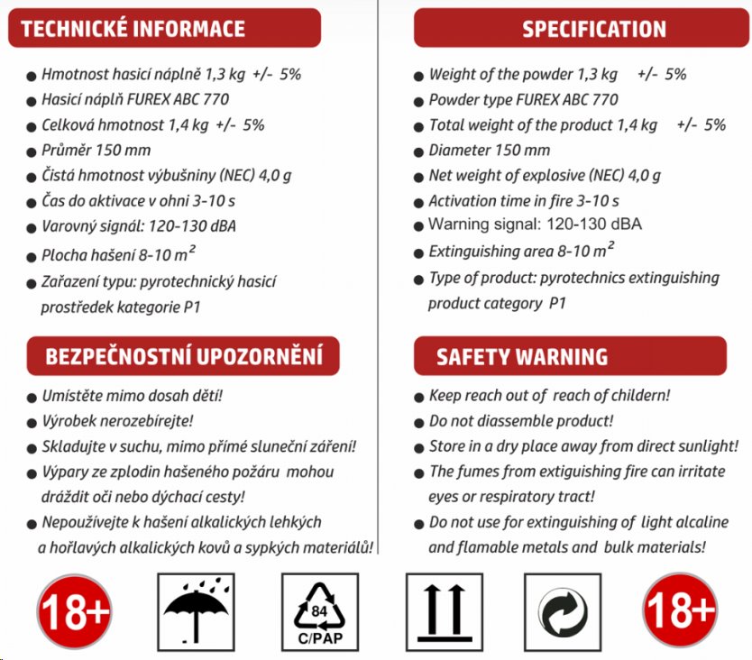 Protipožární hasicí koule je dodávána ve vakuovaném obalu, který obsahuje hasicí kouli s práškovou směsí FUREX 770 a iniciátorem. Při kontaktu s ohněm se aktivuje, vydá varovný signál a uhasí požár na ploše 8–10 m2, obvykle do 3 vteřin. Rozptyl prášku je bezpečný.