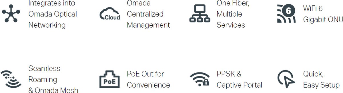 Toto řešení pro Omadu poskytuje gigabitové pasivní optické sítě na podnikové úrovni. Bezproblémově integruje základní komponenty, jako jsou Omada switche, gatewaye, OLT (Optical Line Terminals) a ONU (Optical Network Units) – ideální pro P2MP (point-to-multipoint) prostředí, jako jsou hotely a MDU.