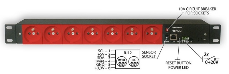 • Rozhraní: RJ45 – Ethernet 10/100Mb, RJ12 – 1Wire a I2C, svorka 4p – logické vstupy, +5V, zem.