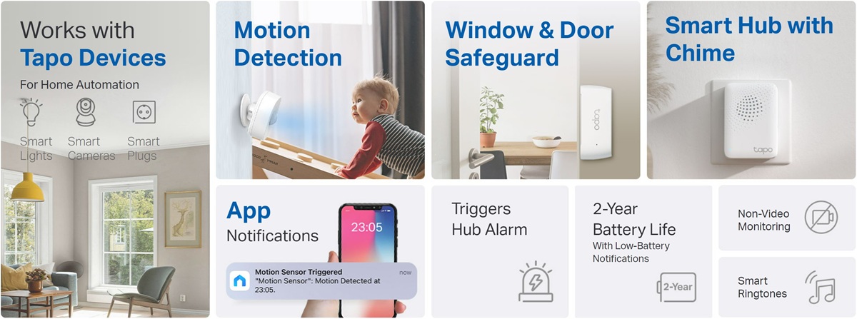 Tapo T30 KIT obsahuje dva senzory na dveře/okno, jeden pohybový senzor a HUB, který propojuje všechna tato zařízení a zároveň funguje i jako alarm.