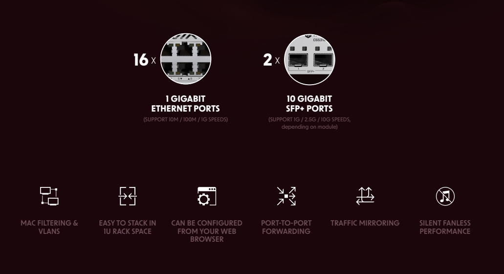 Desktop switch disponující 16x gigabitovými ethernet porty a 2x SFP+ porty pro 10GB optickou konektivitu.