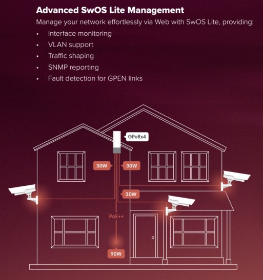 Poskytuje tak cenově výhodnou flexibilitu pro napájení kamer, přístupových bodů a dalších zařízení s SwOS softwarovým řízením.