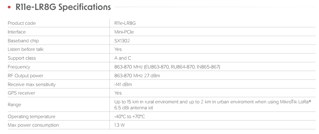 Range: Up to 15 km in rural enviroment and up to 2 km in urban enviroment when using MikroTik LoRa® 6.5 dBi antenna kit
