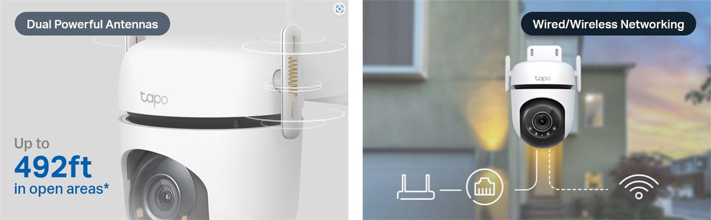 Tapo C520WS IP kamera v provedení PTZ dome, disponuje 4 MP fixním objektivem (2560 × 1440, 30 fps) s fixní ohniskovou vzdáleností 3.2mm a snímačem 1/3". Nechybí ani slot na microSD karty do kapacity 512 GB, IR a bílé světlo na vzdálenost 30 m, audio mikrofon i reproduktor, krytí IP66, 10/100 Mbps LAN port a integrovaná 2,4 GHz WiFi s vestavěnými anténami.