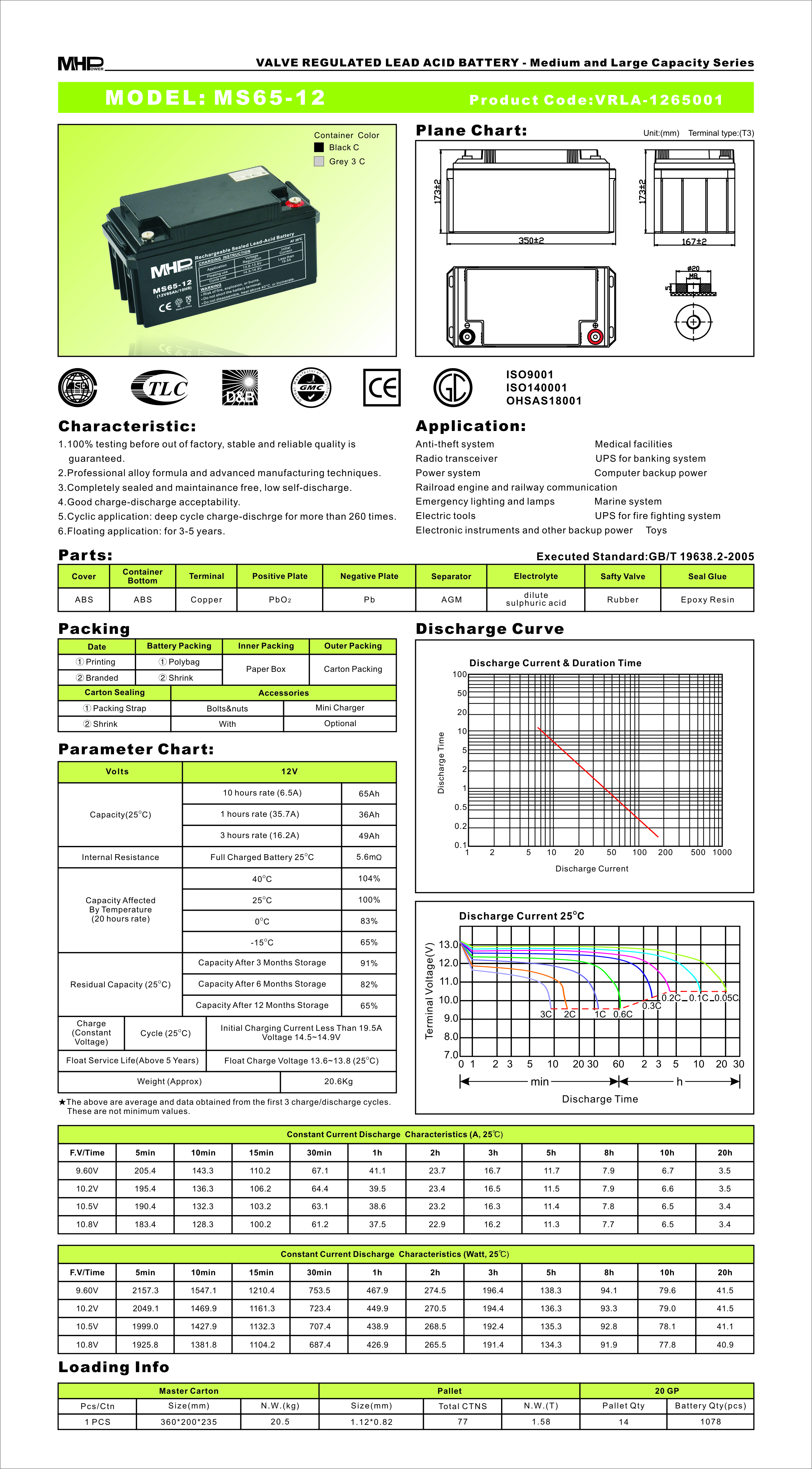 MHPower battery • MS65-12 • MHPower olověný akumulátor AGM 12V/65Ah, Terminál T3 - M8